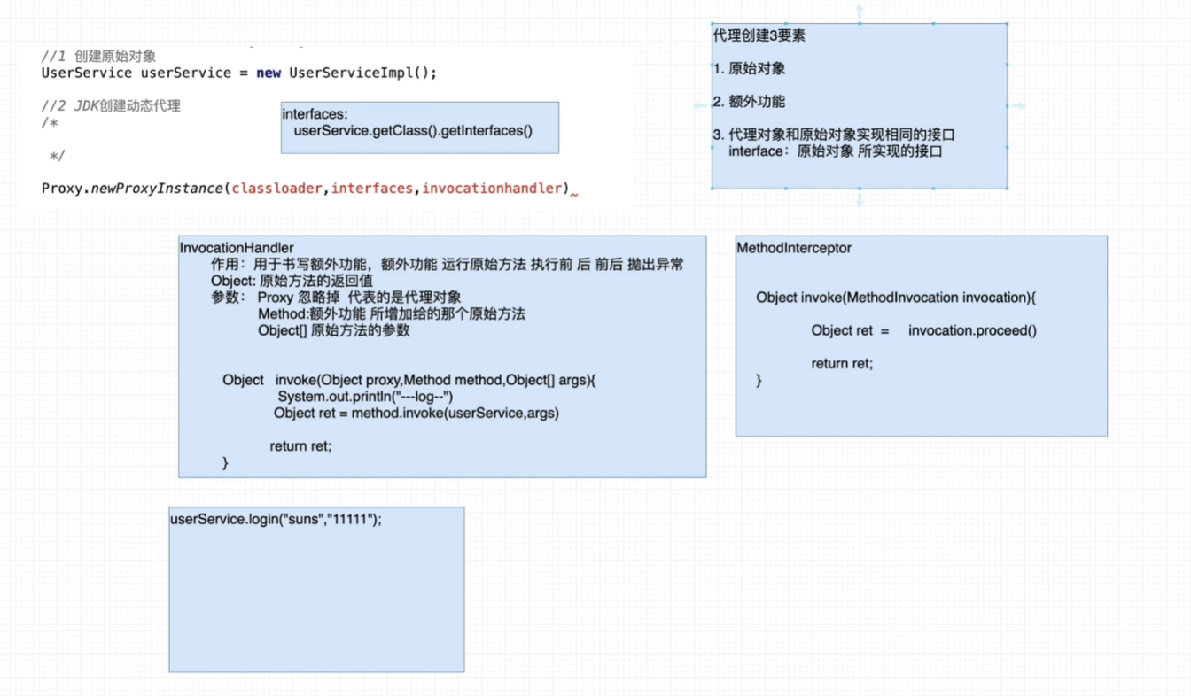 JDK提供了Proxy这个代理类来进行动态代理,可以用newProxyInstance来创建代理类,主要参数是invocationHandler接口,这个接口体现了方法执行的三要素即对象、方法、方法参数,对象由method.invoke来通过反射创建,newProxyInstance中的interfaces参数用于原始对象所实现的接口