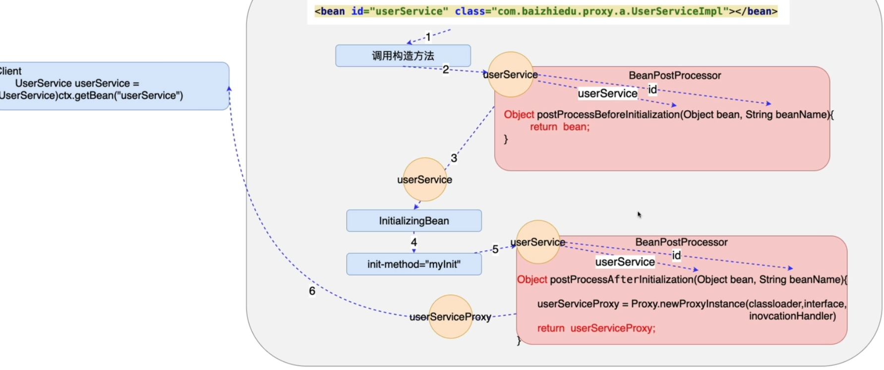 注意:Spring的工厂通过原始对象的id值获得的是代理对象而不是原始对象,ctx.getBean获得的代理对象可以通过声明接口类型来进行对象的存储,其原理是代理类要和原始类一样实现相同的接口,因此可以通过向上转型的方式用接口来存储