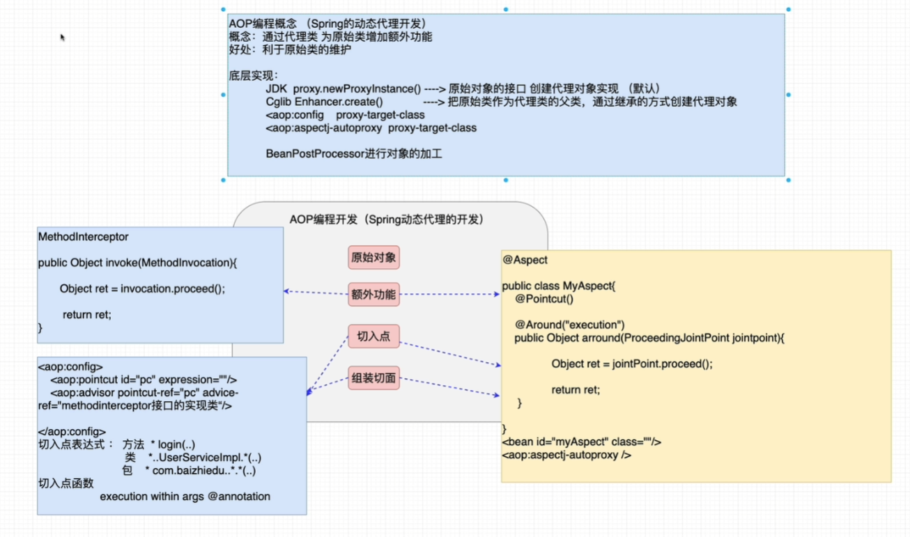 在最开始学习Spring的时候介绍过BeanPostProcessor可以处理由Spring处理以后的对象,结合动态代理可以创建出代理类,一半回在Afer中实现动态代理然后返回给Spring最终得到动态代理对象,Spring也采用的是这种方式,但更复杂,因为还要引入切入点。